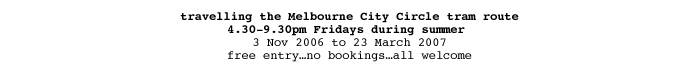 120 laps of the city over 20 Friday evening Departures… 20 pairs of special strangers had an 'overheard' conversational journey of dialogue… 20 artist-led 'overboard' improvised performance journeys… 20,000 souvenir tickets… 40,000 passengers ‘otherwise’ encountering one another… and your hosts from Karachi and Melbourne.